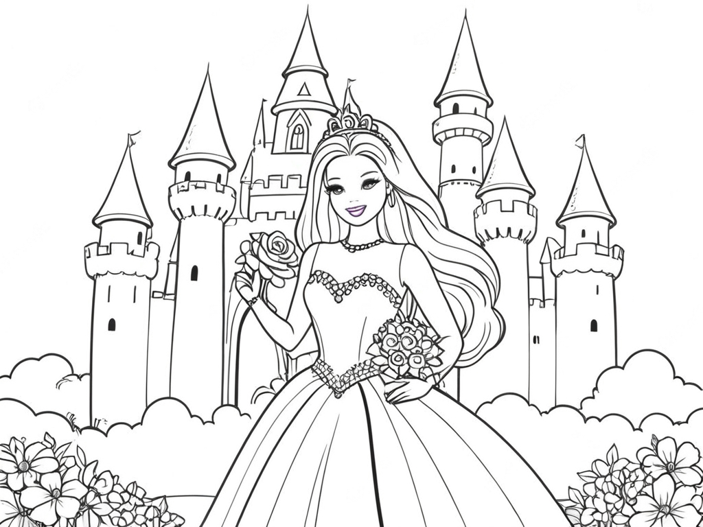 Barbie Princess in a Flower Field Coloring Page
