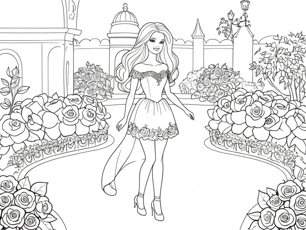 Among many roses and plants, Barbie as a princess strolls through her garden. A perfect design for flower lovers.