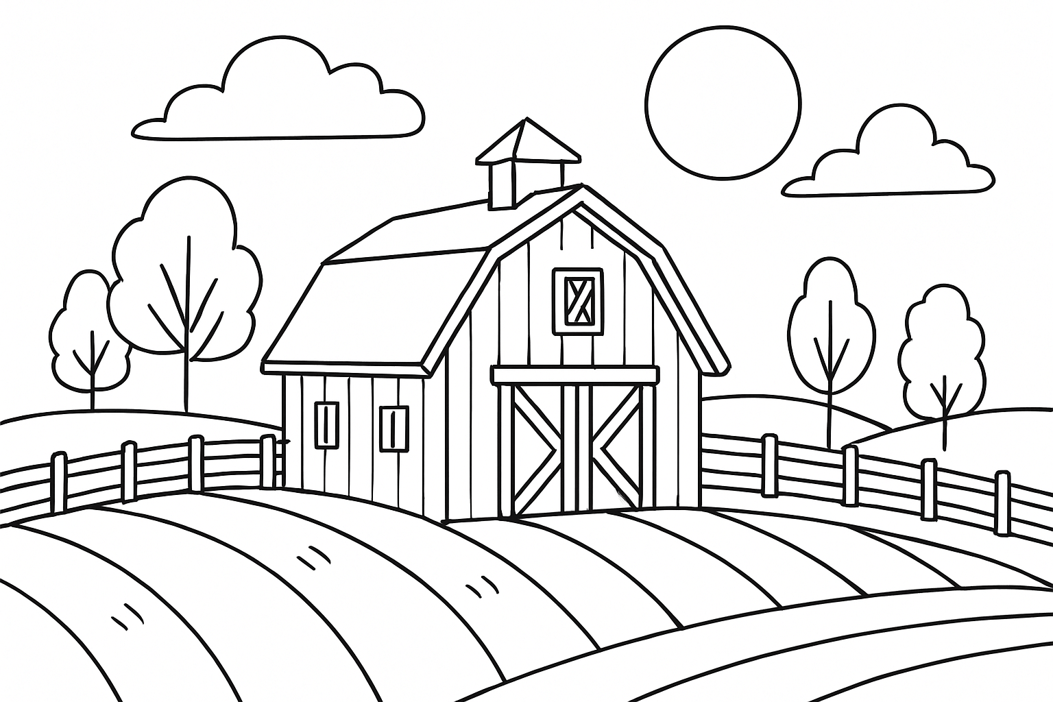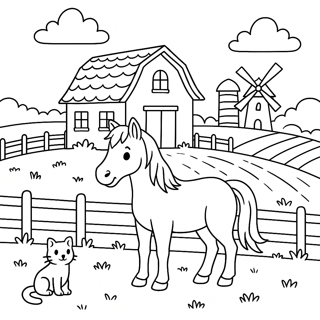 Discover this collection of farm coloring pages. From simple scenes with a barn and animals to creative compositions with vegetable beds, a pond, and harvest time, experience country life in bright colors.