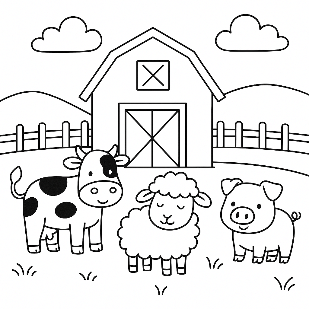 Cow, sheep, and pig in front of the barn, bring them to life with your colors.