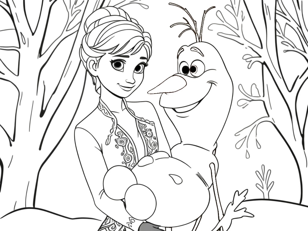 Anna and the cheerful snowman Olaf share fun moments, perfect for bright winter colors.