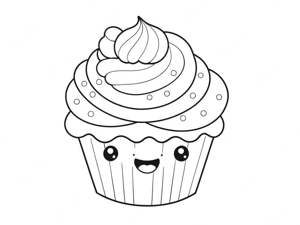 A smiling cupcake with a face, ideal for sweet frosting colors and creative patterns.