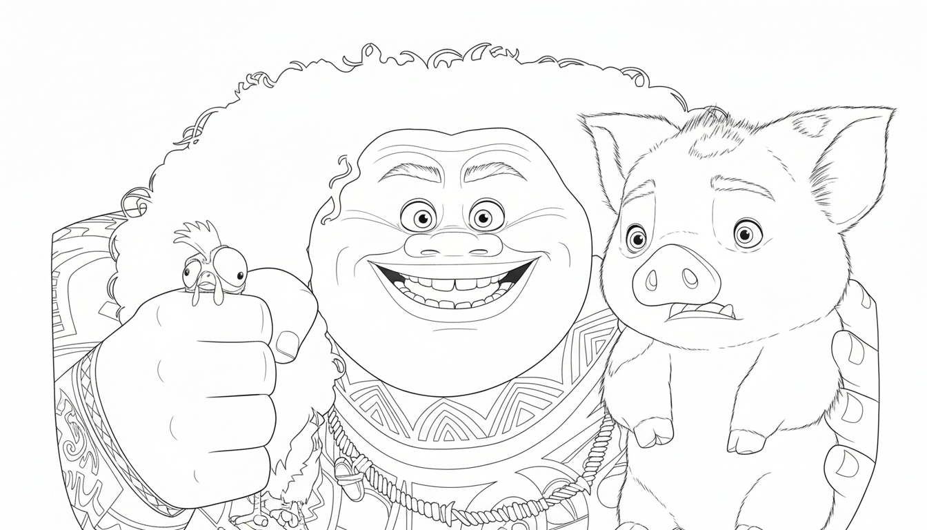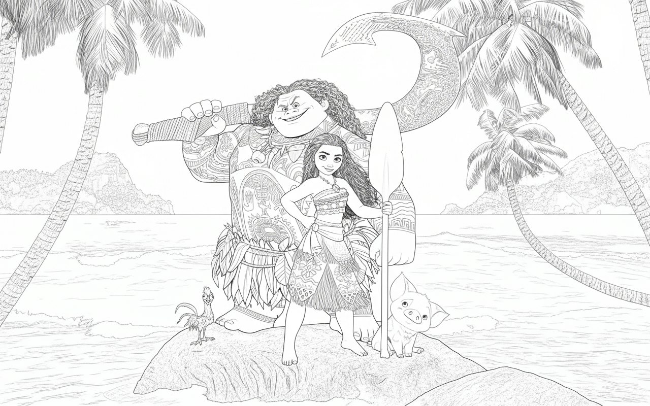 Sail the ocean with Moana, Maui, Pua, and Heihei. This collection of Moana coloring pages includes paddles, crowns, friends, and magical scenes. Pick a favorite, print it, and start coloring - perfect for Disney fans and island adventures.