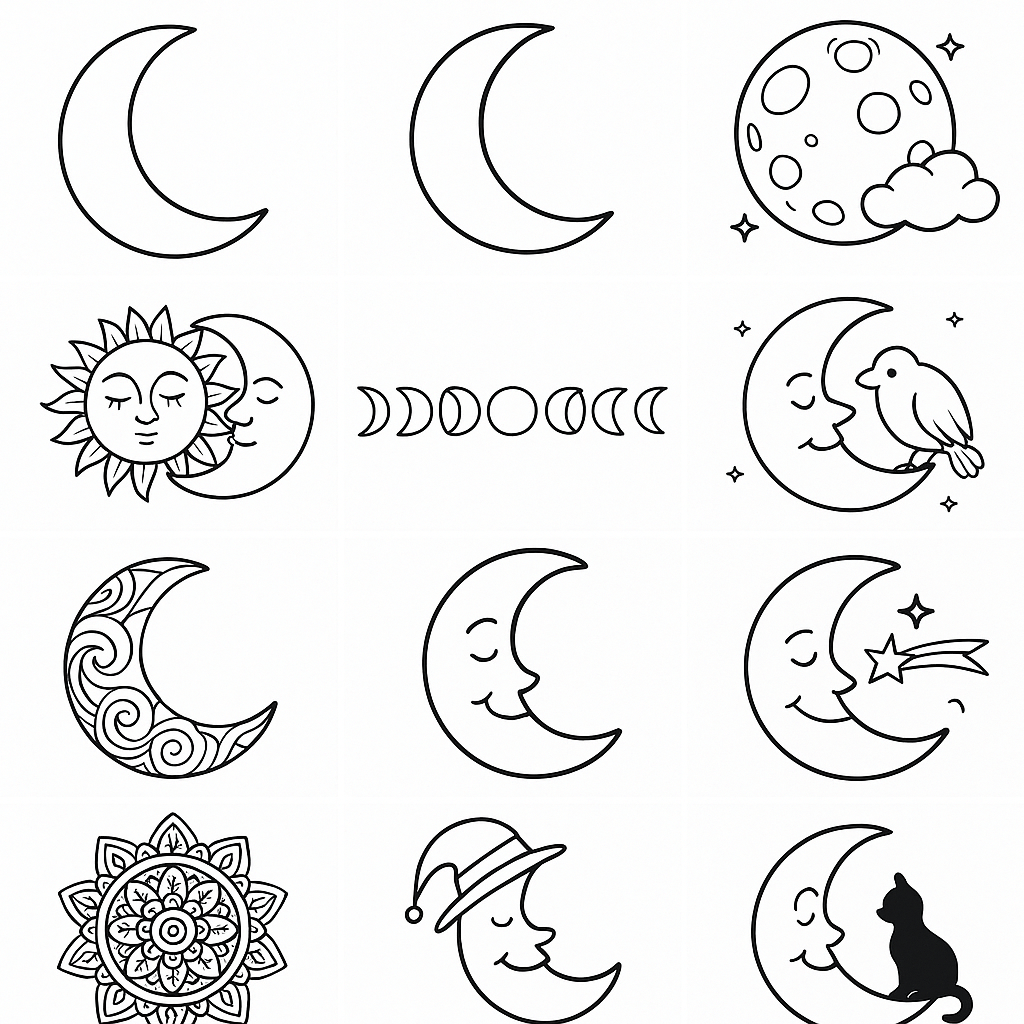 Multiple moon variations in one image for more coloring fun.